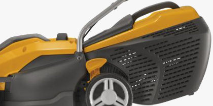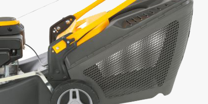 Газонокосилка оснащена ударостойким корпусом, в конструкции которого предусмотрены ограничители. Они защищают стволы деревьев и декоративную мебель от повреждений при эксплуатации модели на участках с большим количеством препятствий.