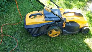 Недостатки: 1. Очень тугая ручка включения питания, при кошении участка до 600м2 устает кисть руки удерживать косилку во включенном состоянии. Альтернатива добавить рычаг включения на две руки.2. Быстрое наполнение травосборника из-за его маленького объёма. При снятии с направляющих, удерживающих травосборник, содержимое последнего вываливается наружу из-за того что травосборник сшит из мягкого материала и не держит форму. Альтернатива пластиковый травосборник.3. Мотор для данной косилки слабоват, при наполнении травосборника на 1/3 начинает урчать, издавая признаки неисправности первого контура обмотки электродвигателя. Альтернатива косить траву без травосборника, после чего одеть травосборник и собирать, то что уже накошено.4. Отсутствие впереди ручки для переноса косилки.