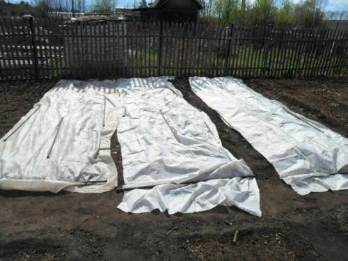 Чаще всего растения укрывают нетканым материалом (спанбонд, агроспан и т.д). В садовых магазинах продаются материалы разного веса и толщины. Для укрытия от заморозков нужно брать изделие белого цвета плотностью от 23 г/кв.м.