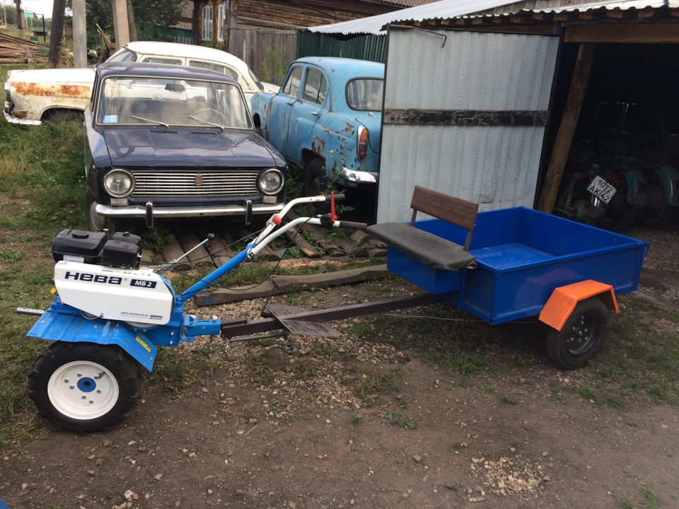 Тележка. Она самодельная. Возил навоз. Грузил килограмм по 250 — едет только с 2мя гирями по 16 кг с переди. Навозил на все 15 соток! Основная беда Невы — малый вес! Это не мотоблок! Это культиватор с излишни весом!