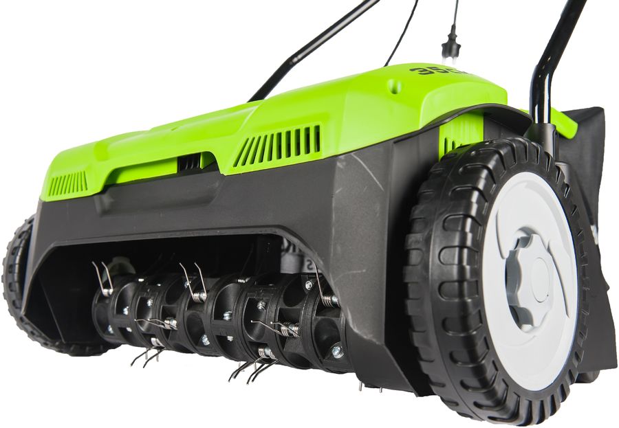 Положение рабочего приспособления относительно поверхности земли задается регулятором, установленным на устройстве. Скарификатор передвигается по газону и прочесывает травяной покров. При нижнем положении вала пружины царапают верхний слой почвы.