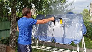 Мини-мойка комплектуется 10-метровым шлангом с фирменным пистолетом EASY!Force. Барабан для намотки шланга не предусмотрен. Пенная насадка идет в продажу как опция. Ее конструкция позволяет ступенчато регулировать подачу моющего средства: на конец заборного шланга в том или ином положении устанавливается специальный клапан, имеющий три отверстия разного сечения. Таким образом, непосредственно во время работы расход не отрегулировать: нужно останавливаться и вынимать шланг из резервуара насадки.