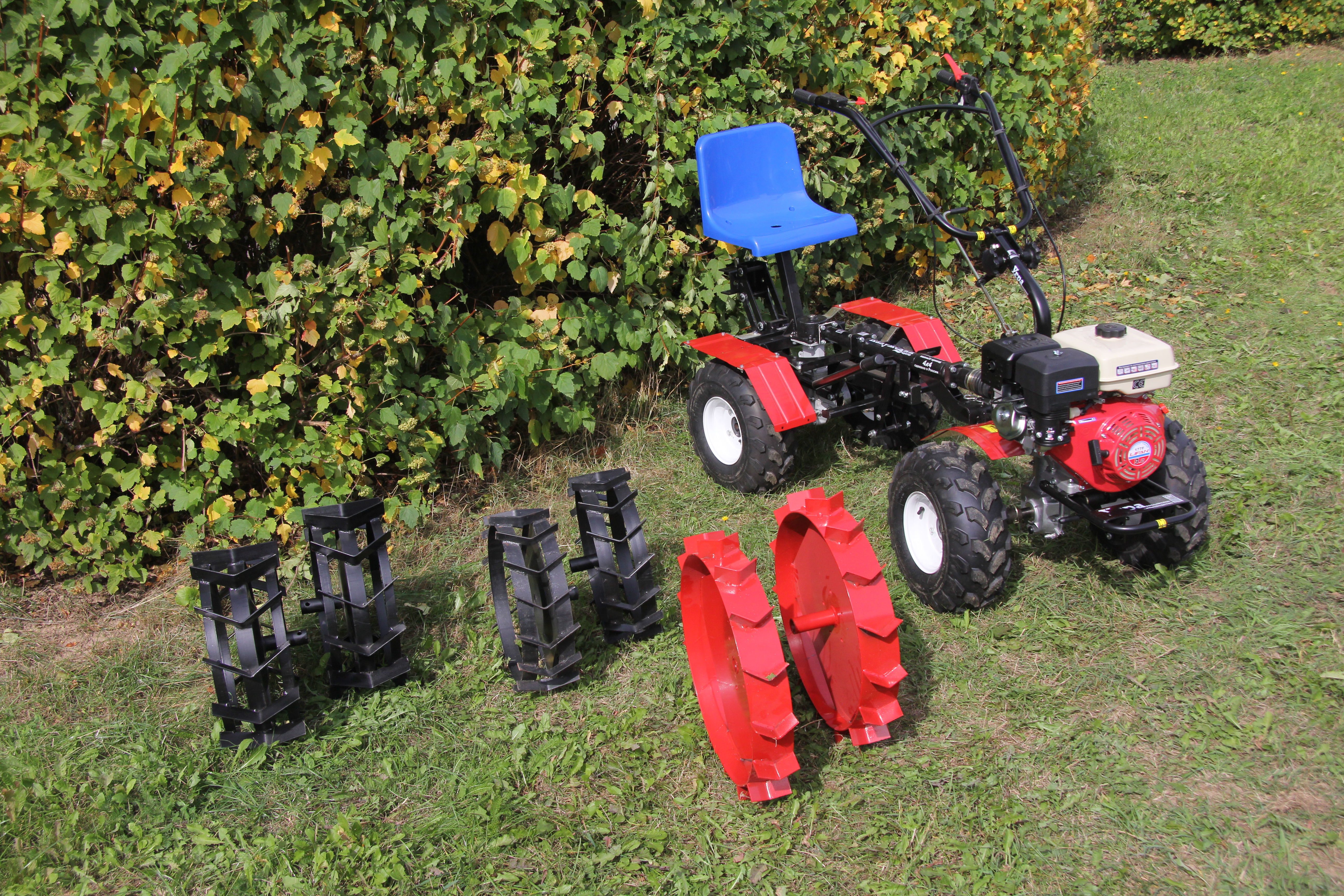 Может соединяться со всеми тяжелыми мотоблоками, не только с мотоблоком «Угра». Для удобства оператора оборудован тормозной ленточной системой, широким сиденьем, кузовом с возможностью снятия, а также механизмом для навешивания дополнительного оборудования.