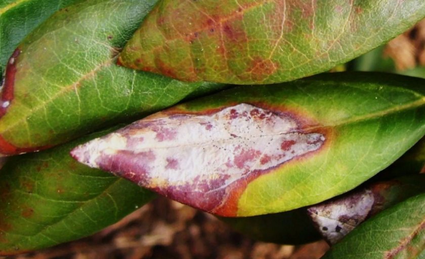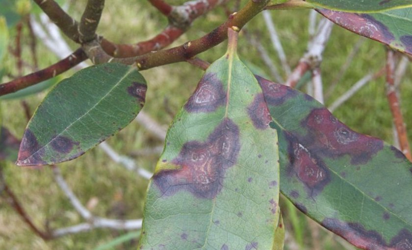 - Антракнозная пятнистость. Коричневые следы на верхней части листьев. Могут поражаться и стебли, которые после засохнут. Свойственно для рододендрона понтийского. Меры борьбы те же, что и с предыдущим заболеванием.