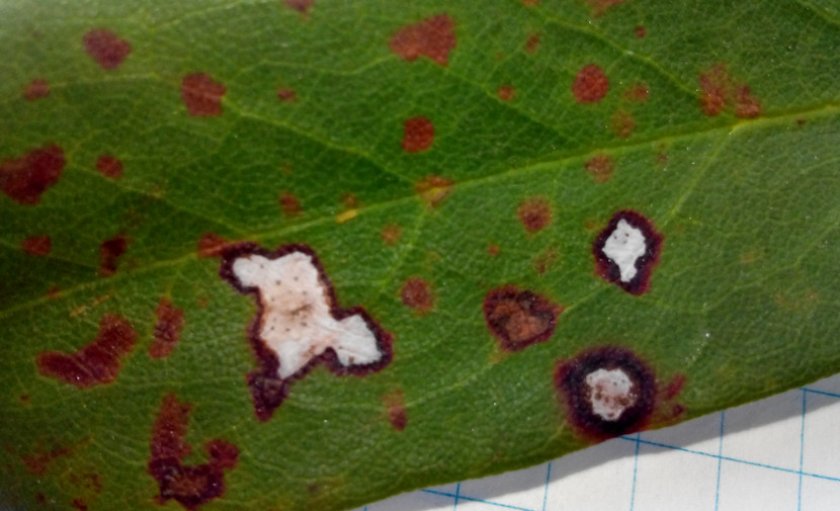 - Филлостиктозная пятнистость. Грибок определяется при обнаружении круглых пятен с красной каймой на листьях или расплывчатых коричневых (либо пепельных), которые находятся на краях зелёной части рододендрона. Меры борьбы такие, как и при прочих грибковых поражениях.