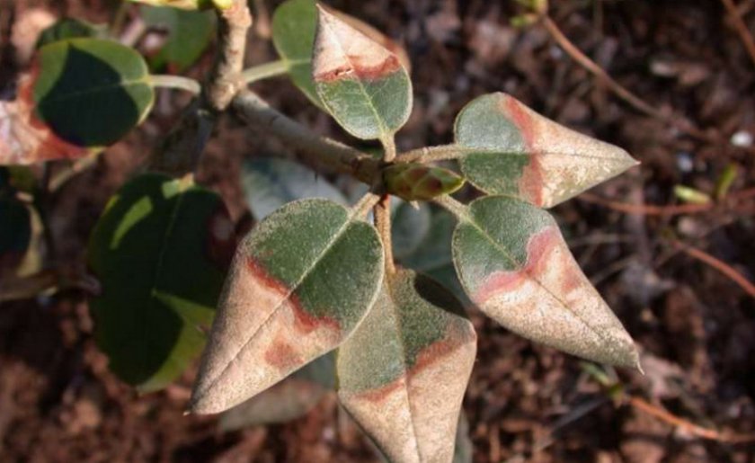- Песталоциевая пятнистость. Гриб поражает листву и стебли. Проявления: небольшие бурые кривые пятна с каймой на листьях, расположенные по их краям. Дальнейшее образование утолщений серого цвета (спороношение возбудителя). Листовые пластины желтеют и засыхают. На стеблях же отметины большого размера, они вдавлены и удлинены. Их поверхность сохнет и становится более светлой со временем. Появляются следы спороношения. Побеги начинают засыхать. Для преодоления болезни важно обрезать все заражённые части кустарника. Весной нужно провести орошение 1% бордоской жидкостью (медным купоросом в известковом молоке), приготовленной по одному из известных рецептов (пример: 1 кг купороса развести в небольшом количестве горячей воды и долить холодной до 50 литров, затем в иной ёмкости погасить 1 кг извести в 50 л жидкости, смешать оба раствора). Можно использовать другой фунгицид и следовать его инструкции.