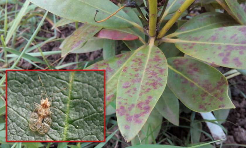 Рододендроновый клоп (Stephanitis rhododendri Horv.) насекомое, длиной до 3 мм. Крылья прозрачные, блестящие, покрывают туловище с боков и с задней стороны. Листья рододендронов, пораженных этим вредителем, становятся бледными, желтовато-зелеными. При более тщательном осмотре нетрудно обнаружить на листьях желтые или желтовато-красные точечки места поражения. С нижней стороны листа можно заметить черно-бурые, влажные или немного подсохшие, смолянистые капельки экскрементов. Сильно пораженные листья слегка скручиваются, засыхают и опадают. Клоп и его личинки, находясь на нижней стороне листа, питаются клеточным соком растений. Взрослые особи появляются летом или в начале осени – сентябре. Самки откладывают яйца на нижнюю сторону листьев, причем предпочитают листья, растущие на концах побегов, прикрывая их бурыми капельками экскрементов. Зимуют яйца на листьях. В июне-июле из яиц отрождаются личинки, которые через месяц превращаются во взрослых особей. Клоп поражает вечнозеленые виды и сорта – в большей степени те, у которых нижняя сторона листа не опушена.