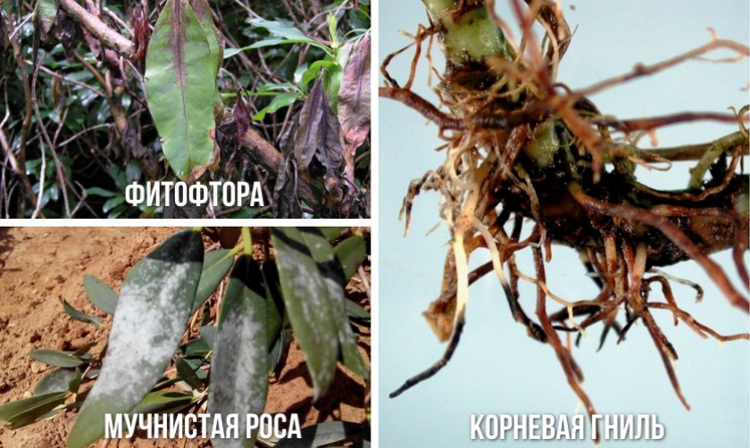 Основными возбудителями заболеваний культуры рода Rhododendron являются грибки. Они возникают в связи с плохой аэрацией переувлажнённого грунта. Растения в результате ослабевают и погибают. Помочь может регулярное проведение опрыскиваний бордоской жидкостью, заражённые части рододендронов требуется уничтожать. Далее перечислены болезни, их проявления, а также способы лечения грибковых инфекций.
