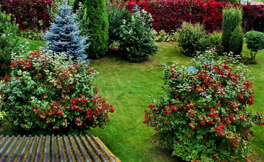 Невысокие кусты можно высаживать в ряд перед забором, терраской или беседкой. Контраст создаст калина, размещённая перед или среди хвойных деревьев и кустов.