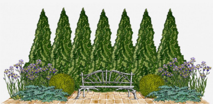 Для создания такой композиции высадку кустов производят ближе. Между ними оставляют расстояние примерно 1,5 м. Формируют пирамидой: для этого берут специальные каркасы, надевают на растения и подравнивают ветки весной. Осенью проводят санитарную обрезку и контролируют результат. Затем ежегодно следят, чтобы ветки росли в правильном, изначально сформированном направлении.