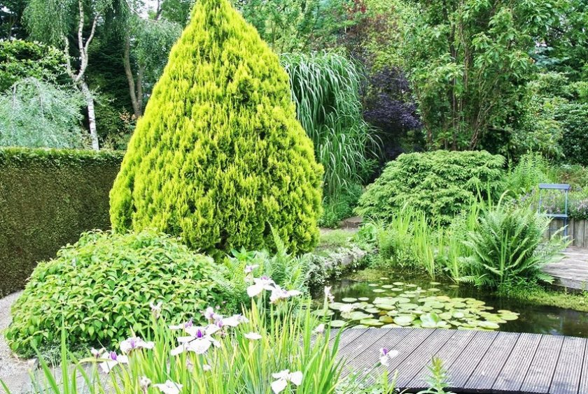 Туя в групповой посадке с карликовыми хвойниками и цветущими растениями.