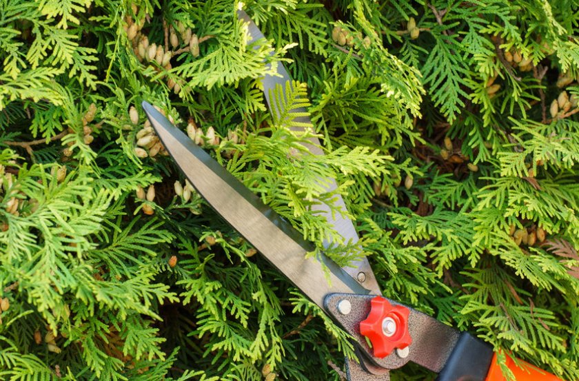 - Производим обрезку. Проводить обрезку можно растению, которое уже достигло возраста 3 лет. Процесс имеет оздоровительную и формирующую цель. Растение способно хорошо переносить стрижку, побеги быстро восстанавливаются. Производить стрижку необходимо в весеннее время. Если вы хотите придать дереву пирамидальную или топиарную форму, помните о том. Что стрижку необходимо начинать с макушки дерева. В конце августа такую процедуру можно повторить, подравнять те ветки, которые выходят за границы куста.