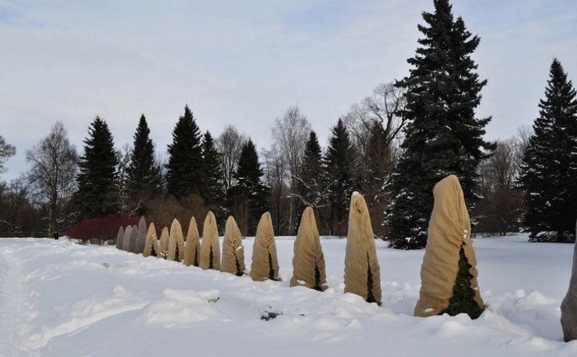 - Подготавливаем растение к земле. Взрослые растения в укрытии на зимний период не нуждаются, поскольку они способны выдерживать понижение температуры вплоть до -42 градусов. Даже если молодые саженцы за зимний период немного подмерзнут, они смогут быстро восстановиться. Взрослому растению можно проводить мульчирование приствольного круга, после чего обильно полить. Молодые деревья нуждаются в укрытии на зимнее время. Ветки можно стянуть и укрыть растение при помощи специального укрывного материала, который не пропускает влагу.
