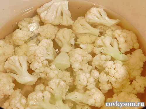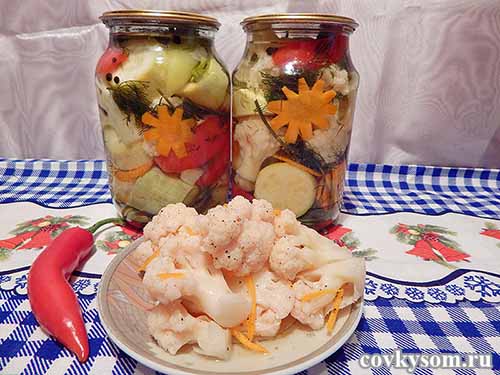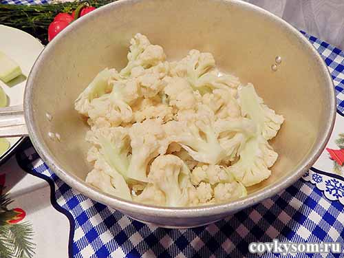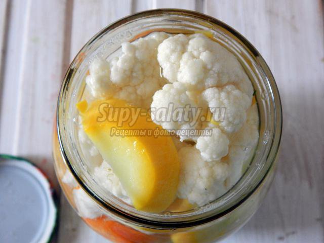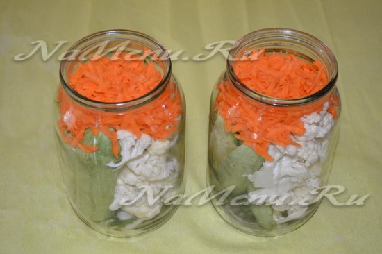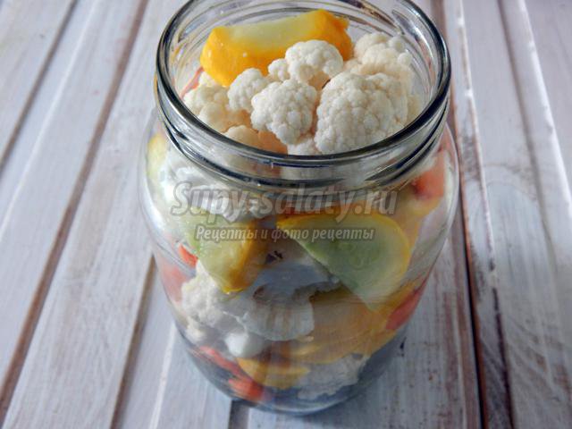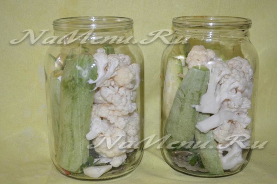 Цветную капусту разбирают на соцветия, отваривают две минуты, сливают воду. Кабачки нарезают бочонками, перец – четвертинками, морковь – кружочками. На дно стерилизованной тары выкладывают зелень, чеснок, подготовленные овощи.