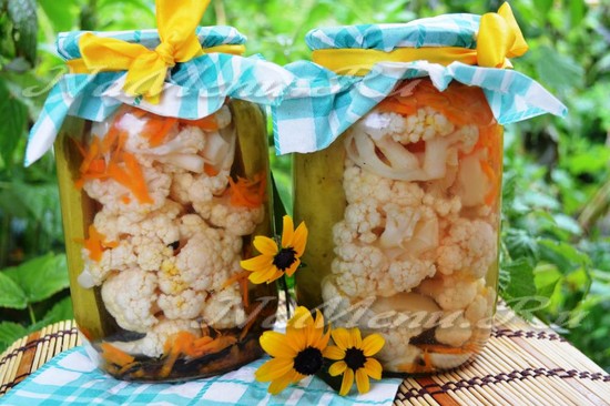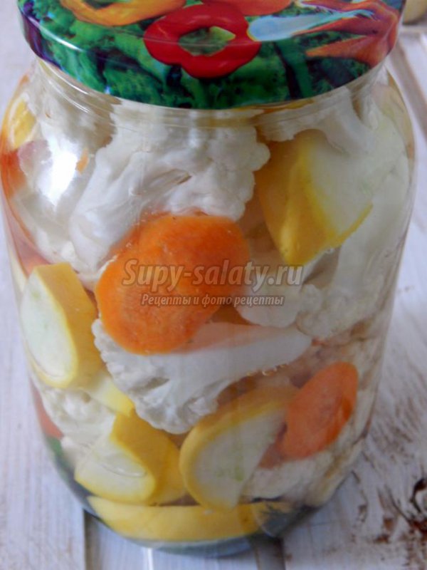 Тем кто любит оригинальные рецепты, подойдет вариант с цветной капустой на зиму. Этот полезный и вкусный овощ отлично сочетается с кабачками, продукты выгодно дополняют вкус друг друга. Кроме капусты понадобится морковка для яркости, а свежая зелень придаст аппетитный аромат. В этом зимнем рецепте используются цуккини, но можно использовать классический сорт кабачков.