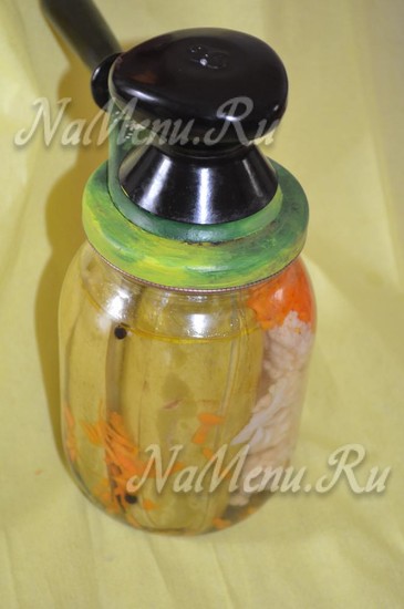 - Затем капуста с кабачками на зиму закатывается, переворачивается вверх дном и заматывается теплым одеялом на 10 часов.