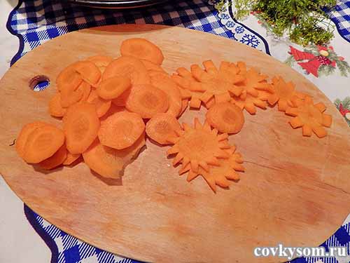 Овощи нарезают соломкой, смешивают все продукты, проваривают 20 минут. Разложив по стерильным емкостям, закупоривают, остужают под шубой.