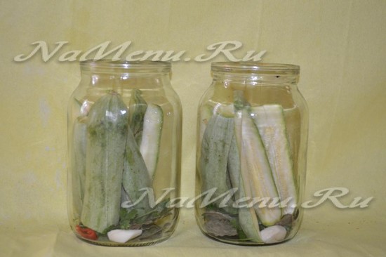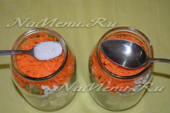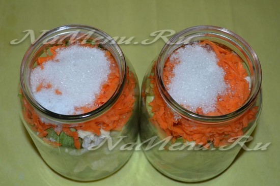 - Морковку, цукини и капусту плотно разместить по банкам.