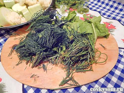 Кабачки выбирают молоденькие, моют, нарезают колечками. Капусту без кочерыжки шинкуют квадратиками. Очищенный чеснок разрезают пополам, зелень моют, дают обсохнуть.