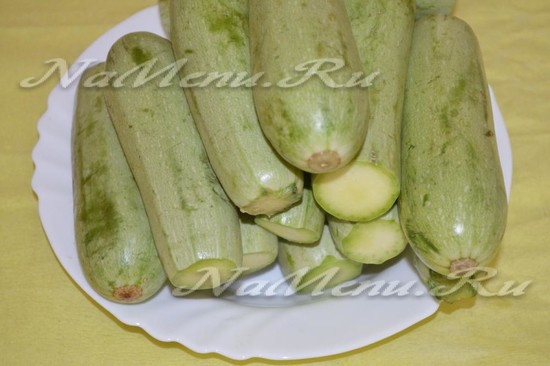 - Кабачки очистить от кожицы, вынуть «внутренности», нарезать крупными брусками.