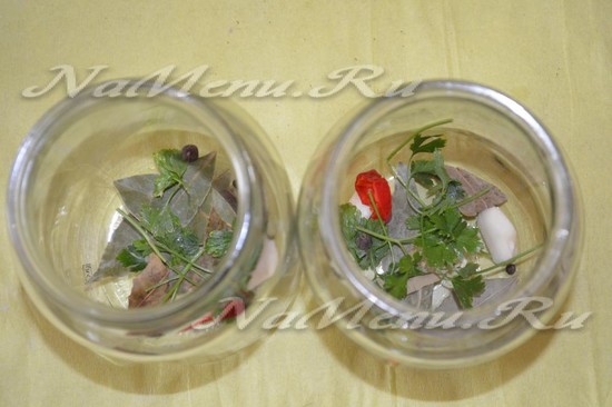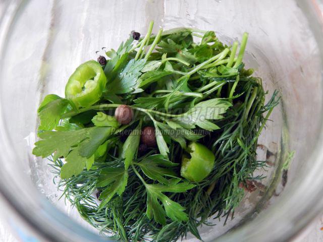 - Выложить в тару веточки зелени, душистый, черный и горький перцы.