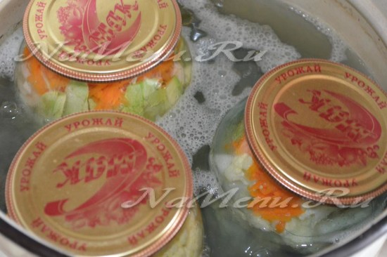 Заготовка делается по рецепту со стерилизацией. Разница заключается в том, что капусту морковь и кабачки закладывают в банки в равных количествах.