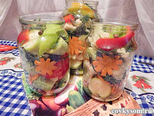 - Выложить овощное блюдо на зиму в стерильную тару, закатать стерильными крышками.