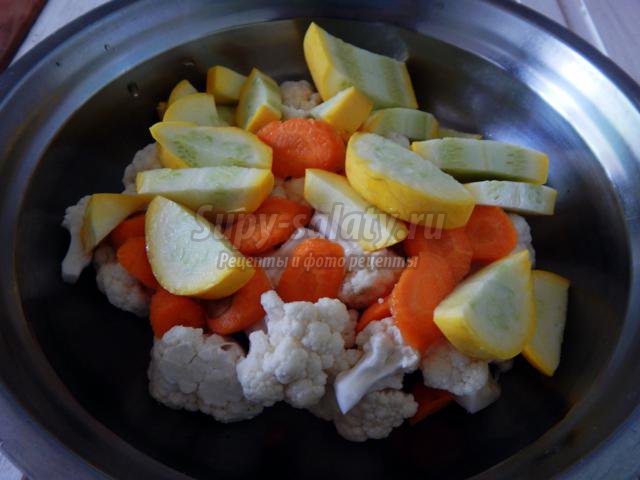 - Овощи помыть, почистить. Капусту разобрать на мелкие соцветия, цукини порезать полукольцами, морковку – кубиками.