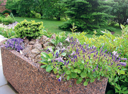 Подойдет любой контейнер, но значительно лучше, если это будет небольшой камень с естественным углублением — обычно используют мягкие породы камней (туф, песчаник, известняк). Всевозможные емкости вроде раковин, старых корыт, детских ванночек в данном случае не подходят, так как сам контейнер должен быть простым, но в тоже время не выглядеть инородным. Пластиковые цветочные ящики смотрятся значительно интереснее, если их задекорировать: обмазать замешанной глиной, обклеить некрупными камушками или галькой. Возможен вариант изготовления контейнеров из бетона, стенки которого задекорировать еще проще.