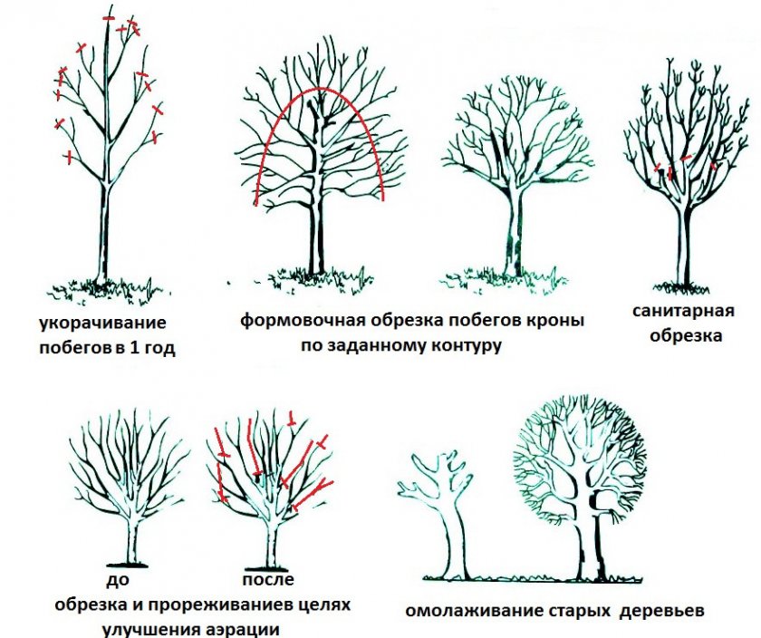 Две процедуры – санитарную обрезку и формирование кроны можно и нужно совмещать. Проводят обрезку уже с первого года жизни. Сперва делают каркас, формируя скелетные побеги. После этого необходимо будет удалять только слабые, повреждённые и растущие внутрь ветви.