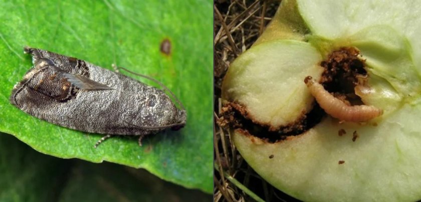 - Плодожорка — это похожая на моль бабочка, серо-коричневого окраса, до 2 см в длину. Метод лечения — опрыскивание «Актарой» (3 г/10 л воды).