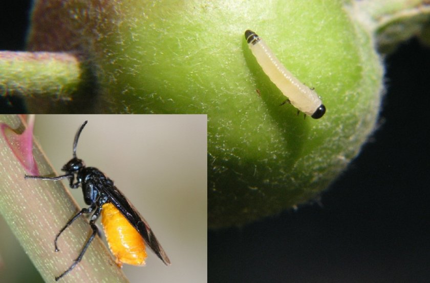 - Плодовый пилильщик — перепончатокрылое, до 7 мм в длину, чёрно-бурого цвета. Откладывает яйца в плодах яблони.
