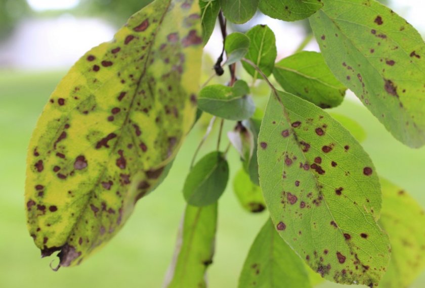 - Парша. Проявляется ранней весной, если сразу же не вылечить, будут поражены плоды. Первичные симптомы: светло-зелёные пятна на наружной поверхности листа. Лечение — опрыскивание средством «Гамаир» (10 таблеток на 10 л воды).