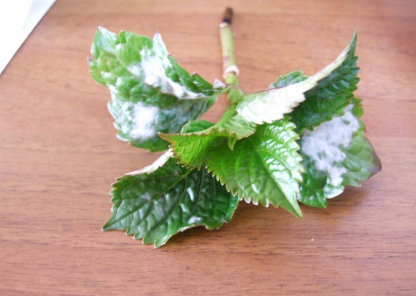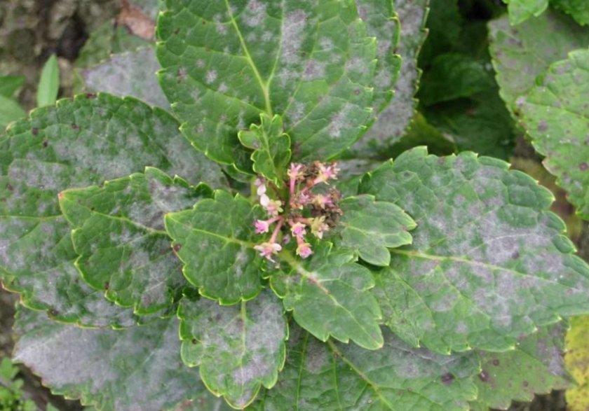 - При чрезмерной влаге в грунте гортензия может страдать от мучнистой росянки или серой гнили. Чтобы спасти цветок, проводится обработка Фундазолом или схожим препаратом, изначально убрав больные побеги. Чтобы обработать растение, нужно 10 мл Фундазола развести с 10-тью литрами воды. Используется на 10 м2 1,5 литра. Обработка проводится два раза с промежутком в 2 дня.