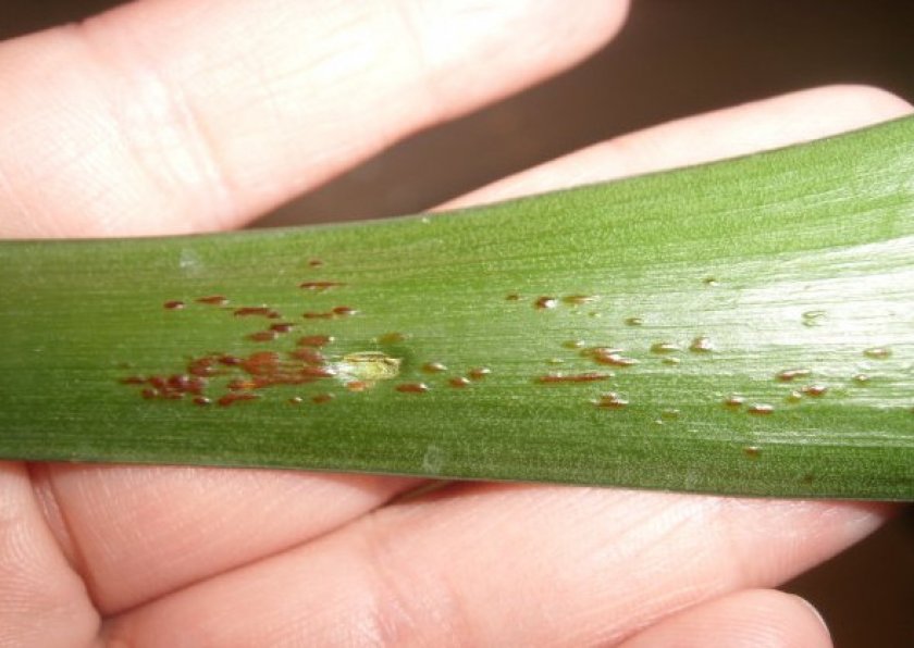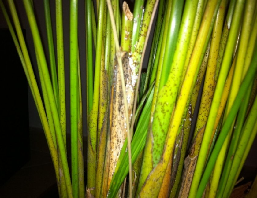 - Трипсы. На то, что они поселились на растении, указывают мелкие отверстия на листьях, бурые пятна, деформация стеблей. Их размножению способствует сухой воздух и отсутствие опрыскиваний. Лечат пальму путём опрыкивания инсектицидами «Актеллик», «Инта-Вир», «Фитоверм», «Актара».