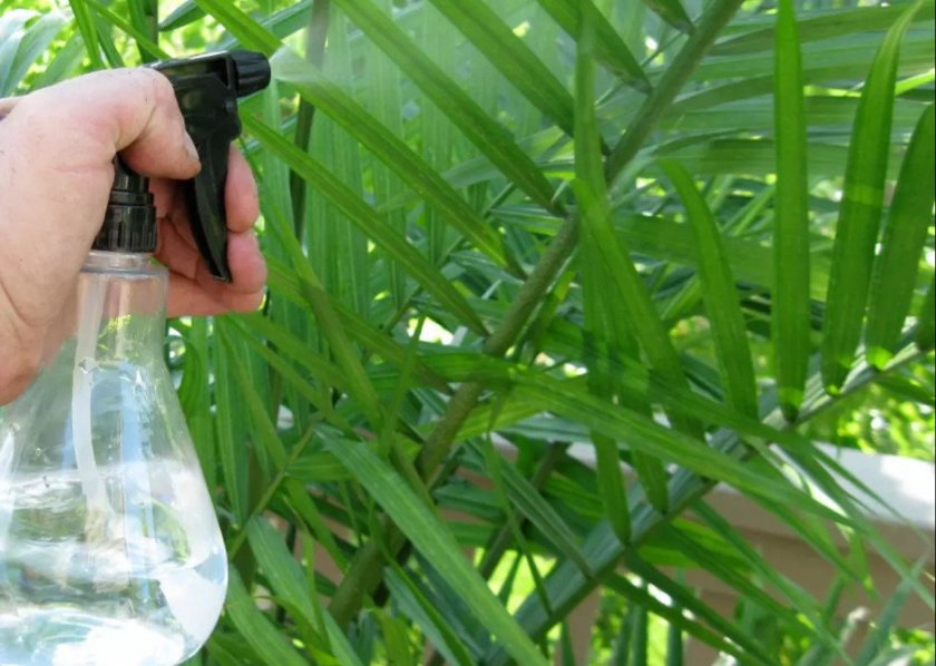 Наливаем в опрыскиватель только отстоянную воду комнатной температуры и распыляем над растением на расстоянии не менее 0,5 м. После душа, подождем выставлять хризалидокарпус с каплями воды на листьях под летнее солнце или сквозняк.