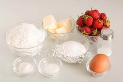 Для приготовления этого вкусного домашнего печенья нам понадобятся следующие ингредиенты: пшеничная мука, свежая клубника, сливочное масло, сахарный песок и ванильный сахар, куриное яйцо, разрыхлитель теста и немного соли (для усиления и баланса вкусов).