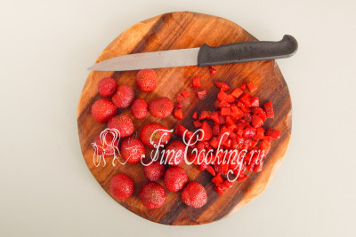 Нарезаем ягодки мелким кубиком – чем клубника плотнее, тем лучше.