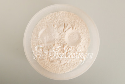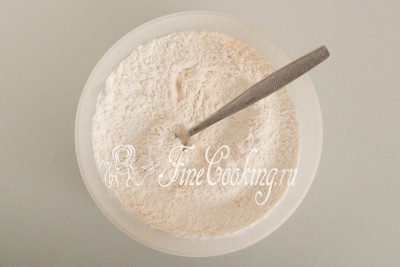 Смешать вместе просеянную муку, соль и разрыхлитель теста.