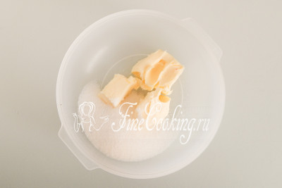Пересыпать сахар в глубокую миску и добавить мягкое сливочное масло. Взбить миксером до пышного состояния (на это уйдёт около 4-5 минут).