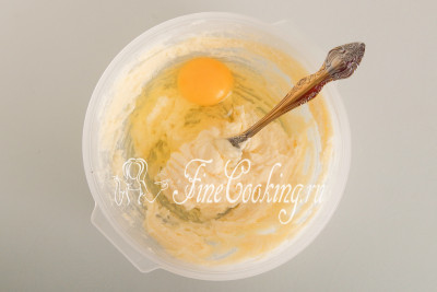 Перетираем масло с сахаром вилкой или взбиваем миксером, чтобы они соединились в однородную массу и посветлели. Следом кладем одно куриное яйцо.