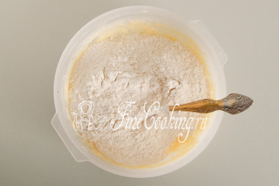 Смешать белую пшеничную муку высшего сорта с разрыхлителем теста и просеять сухую смесь в масляную массу.
