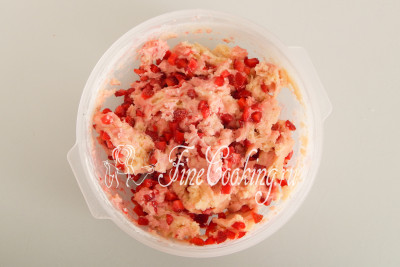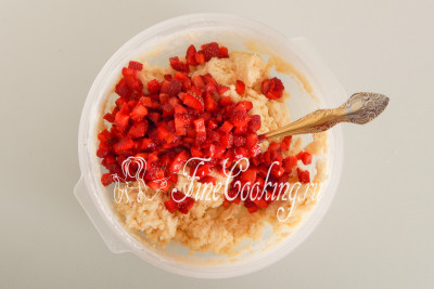 Очень бережно вмешать лопаткой клубнику в тесто. Старайтесь не прилагать слишком много усилий при перемешивании, чтобы не повредить клубнику, иначе из неё выделится много сока, тесто станет влажным и окрасится в розовый цвет.