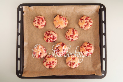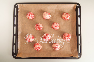 Скатать печенье размером с грецкий орех и выложить на противень, застеленный пекарской бумагой. Печенье можно слегка придавить чтобы придать ему приплюснутую форму.