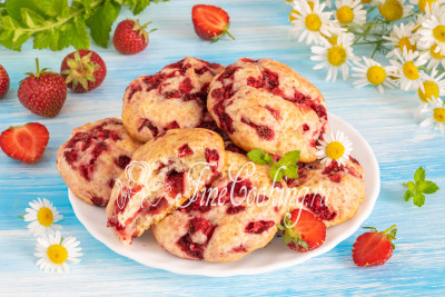 Нежное, мягкое и в меру рассыпчатое тесто идеально сочетается с сочными и ароматными кусочками свежей клубники. Готовьте на здоровье, друзья, и приятного вам аппетита!