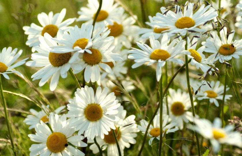 - Луговая ромашка. Считается самым распространённым цветком, выращиваемым на лугах. Прекрасно сочетается с разными культурами. Цветёт с апреля по октябрь. Высота кустов достигает 90 см.