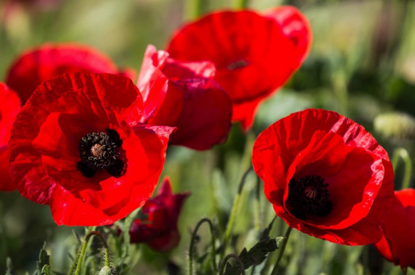 - Мак. Характеризуется яркими красными соцветиями, которые красиво контрастируют на фоне зелёной травы. Цветёт растение в течение двух недель. Достоинство этой культуры заключается в том, что она обеспечивает самосев.
