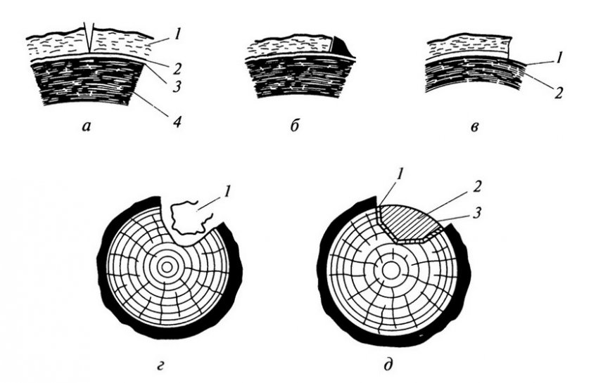 Уход за стволами деревьев: а — строение ствола дерева: I — кора; 2 — луб; 3 — камбий; 4 — древесина; б — камбий, неправильно закрытый садовой замазкой; в — камбий, правильно закрытый садовой замазкой: 1 — замазка; 2 — антисептик; г — очистка дупла: 1 — гниль; д — пломбирование дупла: 1 — антисептик; 2 — пломба; 3 — замазка