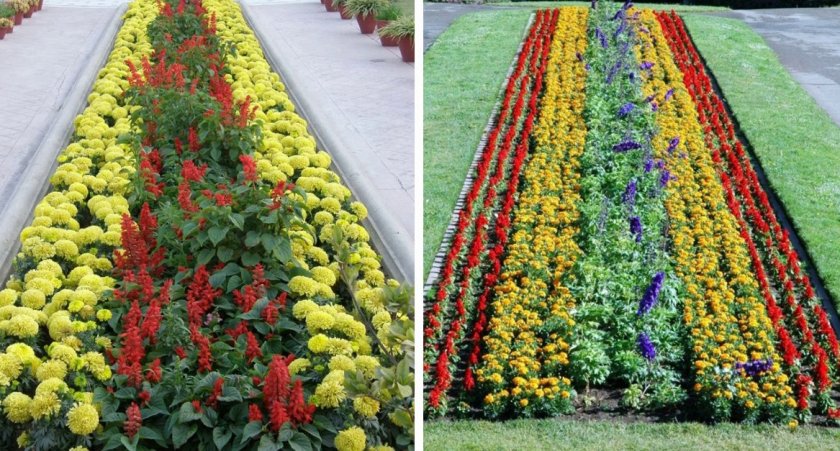 В рабатке можно сочетать лиственные и цветущие растения, многолетники и однолетники. Клумба монохромного типа содержит цветы одного окраса, но разных видов и сортов. Для двухцветной грядки выбирают либо контрастные оттенки, либо одинаковый колер, но разного оттенка, например красный и бордовый. Небольшой по размеру цветник обычно украшают 1–2 культуры.