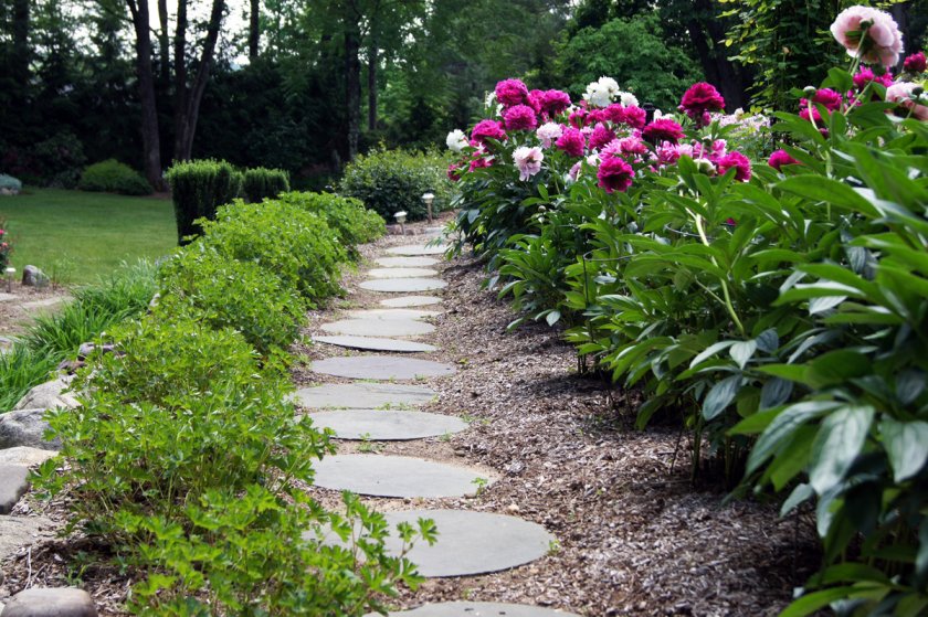 Пионы в рабатке высаживаются по центральной линии с одинаковым интервалом между кустами, а остальное пространство заполняется более низкой растительностью.